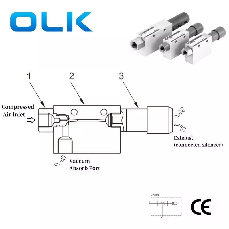 Оулеикаи (ОЛК) ЦВ вакуумски генератори користе се за пружање вакуумског окружења потребног за усисавање млазница или учвршћења. Утисни порт треба да буде повезан на компримовани ваздух, док је усисни чашица повезан на вакуум порт. Када се компримовани ваздух токо пролази из усисне луке до издувне луке, вакуум се генерише на вакуумској луци. Ова вакуумска сила може се користити за придржавање предмета, постизање задатака попут фиксирања или подршке, на тај начин побољшање оперативне ефикасности у индустријској производњи.