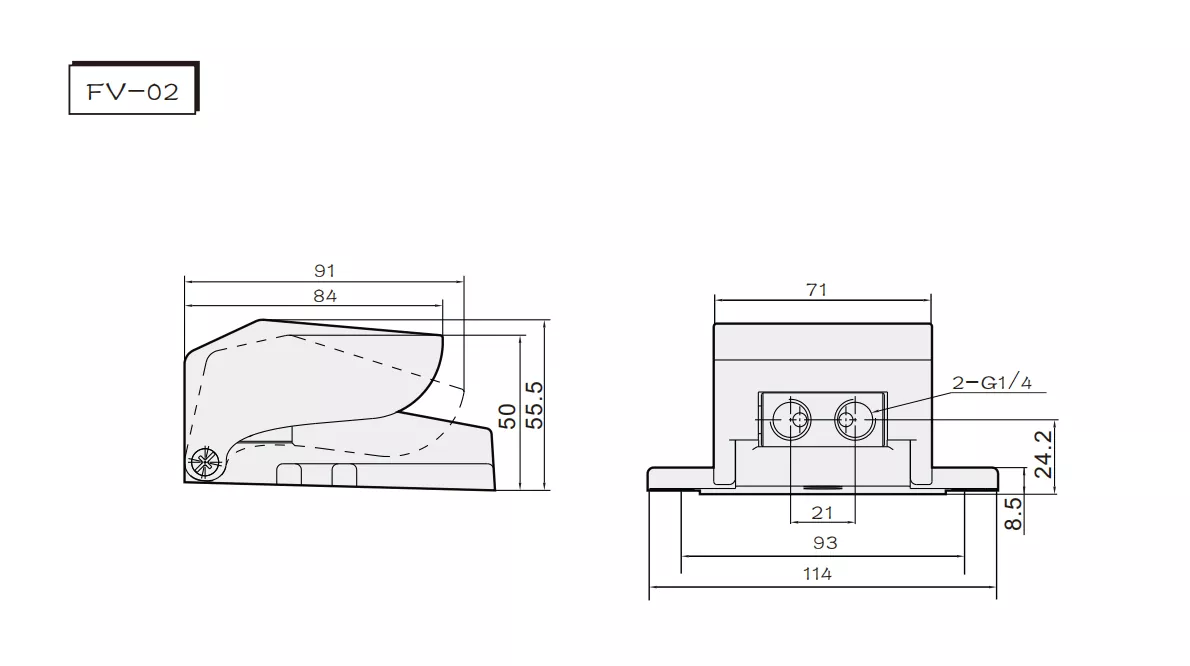 Компактни ФВ-02 пнеуматски ножни вентил за 3 пута направљен од црног материјала од легуре алуминијума. Двопозицијски тросмерни, нормално затворен дизајн директног дејства, са аутоматским ресетовањем опруге. Само стане на педалу да прозрачиш. Приликом одабира конектора, препоручује се коришћење ПЦ равних конектора, који су једноставни за руковање и практични. П порт за усис и А прикључак за издув. Уграђени Р издувни отвор. Због своје једноставне структуре један у један излаз, производ је погодан за контролу отварања и затварања једног ваздушног пута, као што су полуаутоматска мала опрема или испитни столови