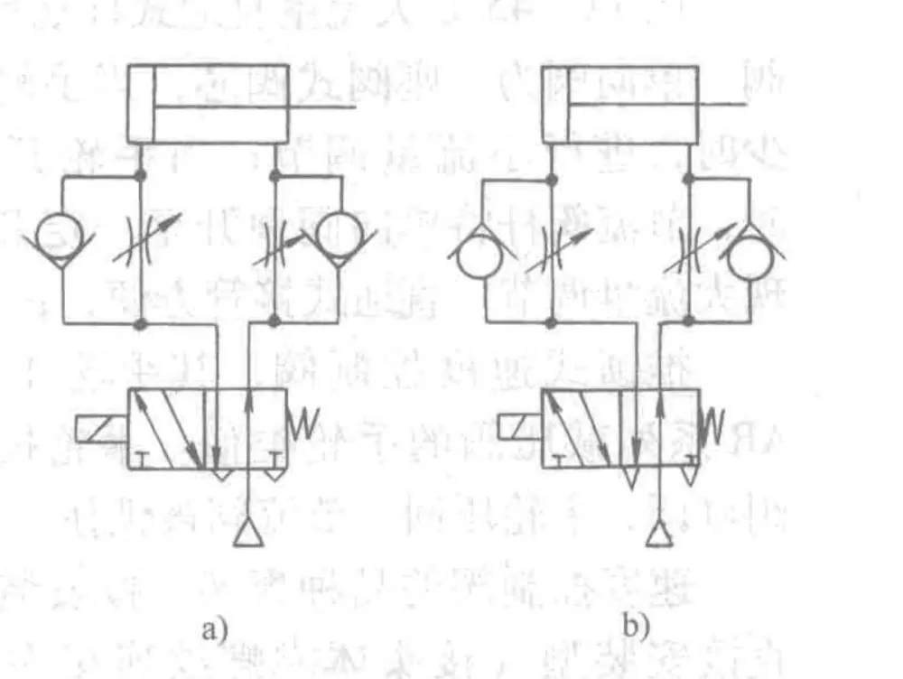· У (а) (пригушивање издувних гасова), када је смерни вентил под напоном, неповратни вентил на улазној страни цилиндра се отвара, омогућавајући страни без шипке да се брзо напуни. Ваздух са стране шипке може да излази само кроз пригушни вентил. Подешавањем отвора за гас, брзина цилиндра се може контролисати. Ова метода обезбеђује стабилно кретање клипа и најчешће је коришћено коло.