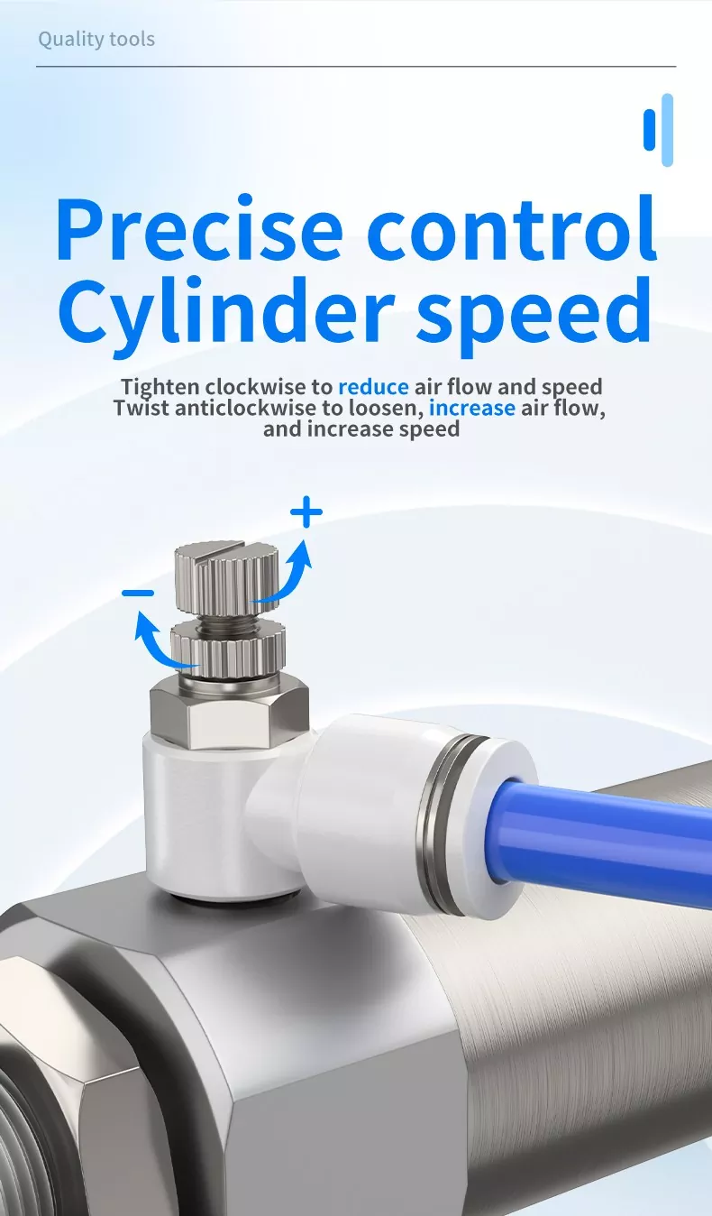 Регулатори брзине су уобичајене пнеуматске компоненте које се користе за подешавање брзине извлачења и увлачења актуатора. Пригушни вентили су у суштини компоненте за подешавање протока које контролишу брзину цилиндра, али се њихови положаји уградње, правци пригушивања и дизајн тела разликују. Према начину управљања, могу се поделити на тип пригушивања издувних гасова и тип пригушивања улаза.