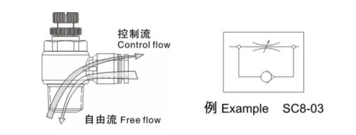 Из функционалних симбола можемо видети да су и издувни и улазни вентили за контролу протока једносмерни пригушни вентили, који контролишу проток у само једном смеру док дозвољавају обрнути проток ваздуха да слободно пролази. За цилиндре са двоструким дејством, издувни вентили за гас су пожељнији за побољшање стабилности кретања цилиндра. За цилиндре са једносмерним дејством, који обично користе опругу за извлачење или увлачење када нема довода ваздуха, гас мора да савлада силу опруге током рада, тако да су пригушни вентили за усисни гас погодни за контролу брзине.