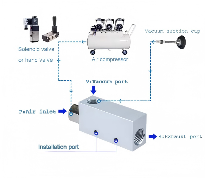 Генератор вакуума је нова врста ефикасне, чисте, економичне и мале компоненте вакуума која користи извор ваздуха са позитивним притиском за стварање негативног притиска. Ово чини веома лаким и практичним постизање негативног притиска на местима са компримованим ваздухом или на местима где су потребни и позитивни и негативни притисци у пнеуматском систему.