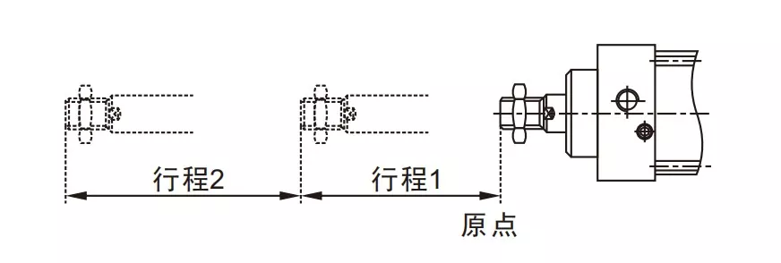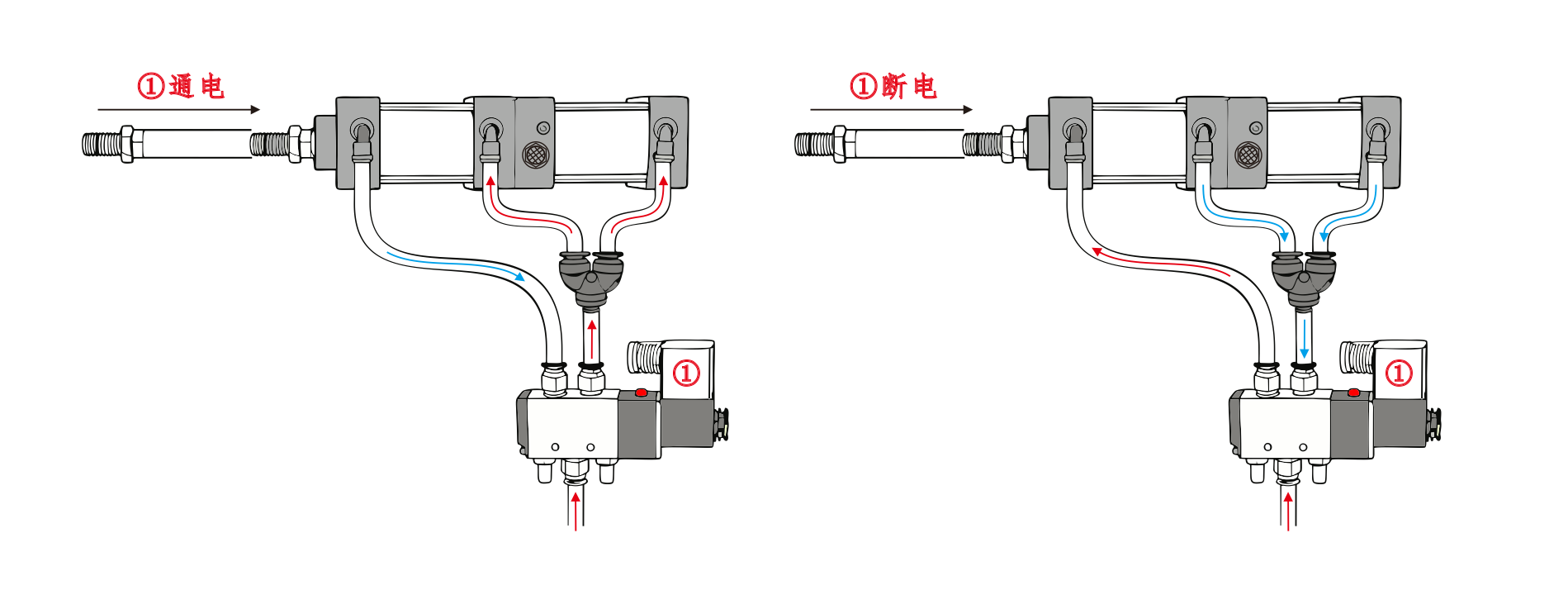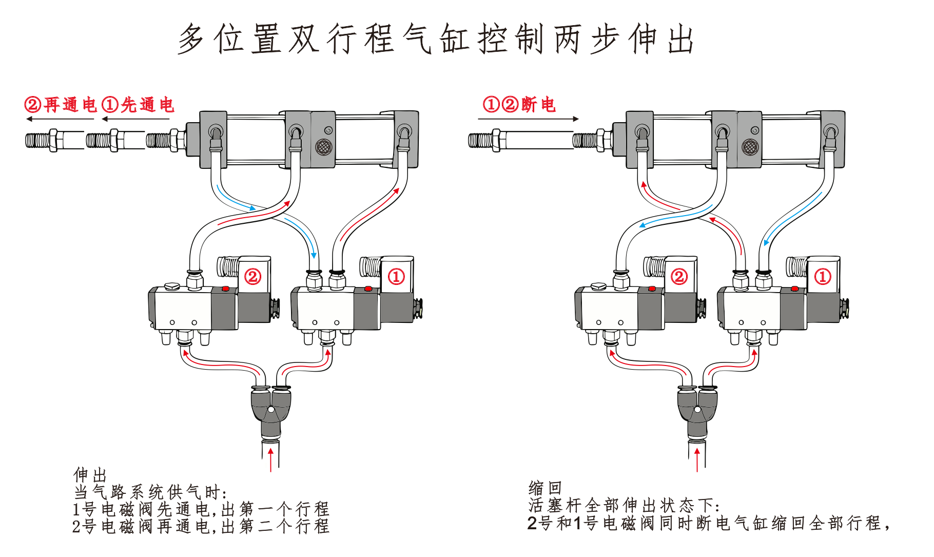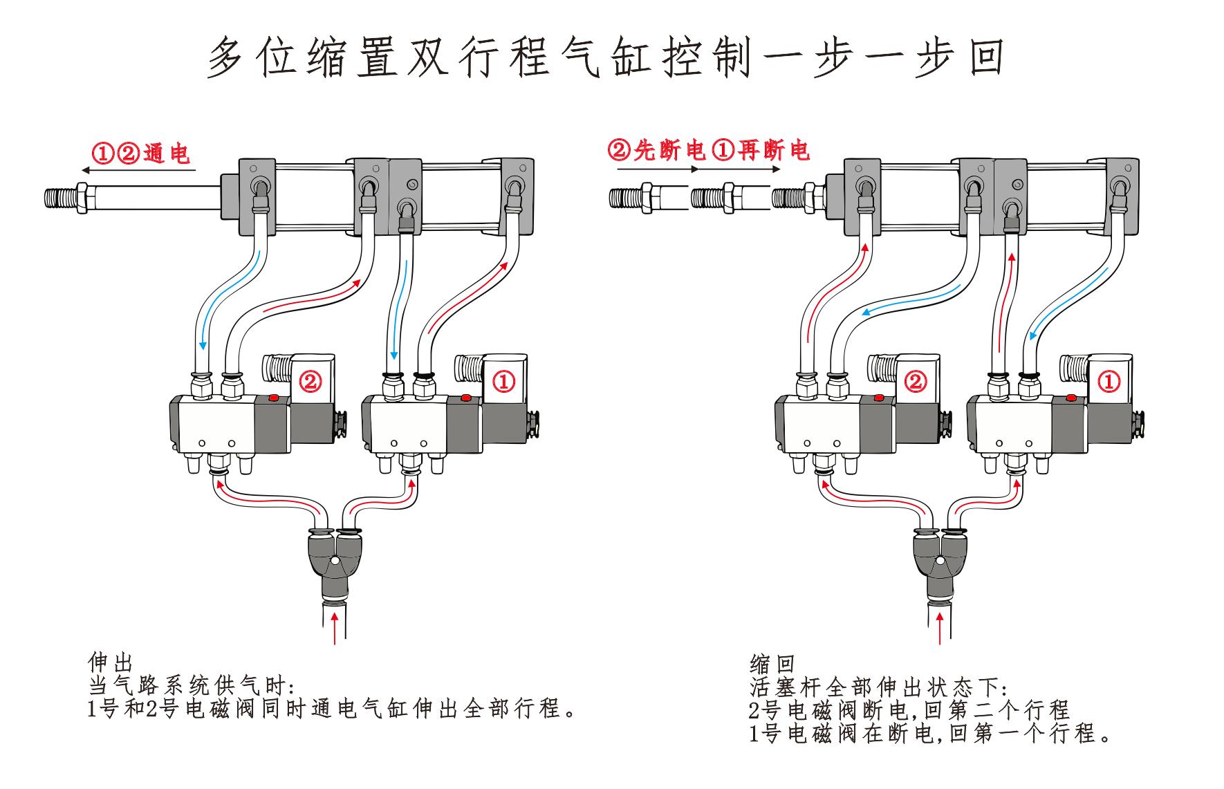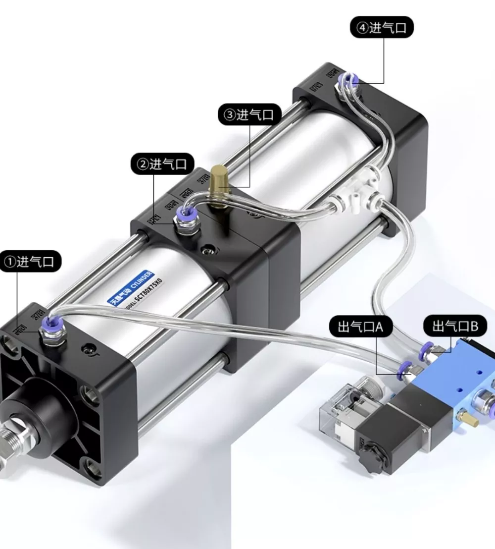 Улаз за ваздух цилиндра① је повезан са прикључком А електромагнетног вентила, а улаз за ваздух цилиндра④ је повезан серијски са прикључком Б електромагнетног вентила. Улаз за ваздух цилиндра③ је повезан са пригушивачем. Када је прикључак А соленоидног вентила под напоном, цилиндри остају у увученом положају. Када је порт Б под напоном, цилиндри почињу да раде.