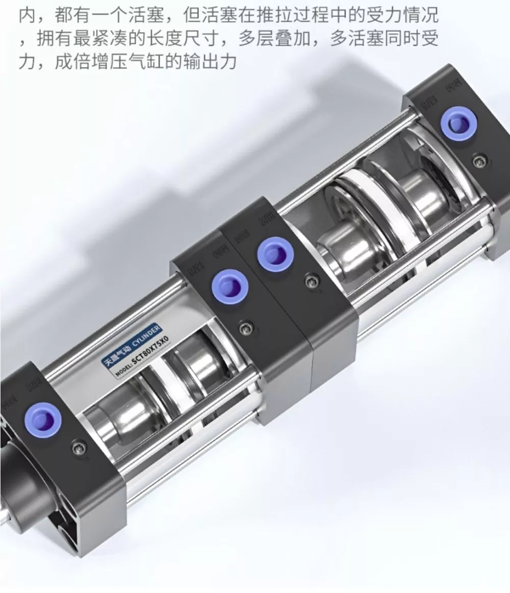 СЦТ цилиндар клипњаче има двосмерне ИЦЦ заптивне прстенове и моћан двотактни дизајн, са компактним и префињеним изгледом који обезбеђује брзу акцију и несметан, стабилан излаз. Сваки слој цилиндра садржи појединачни клип, а током процеса пусх-пулл више клипова деле оптерећење, омогућавајући цилиндру да постигне најкомпактнију дужину док генерише умножену излазну силу кроз своју вишеслојну сложену структуру. Овај дизајн двоструке силе пружа јачу снагу, а конфигурација са шест заптивних прстена пружа одличне перформансе заптивања, омогућавајући цилиндру да издржи притисак до 1,4 МПа без цурења.